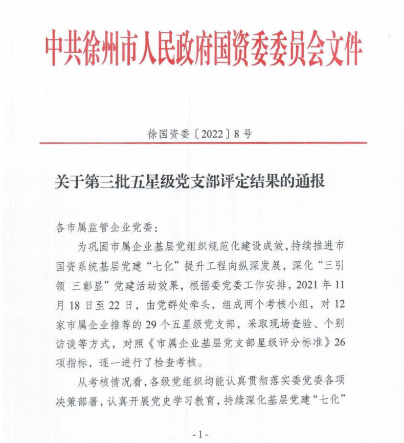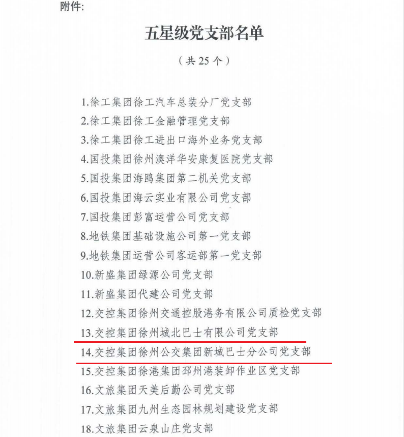 市國資委黨委還下發(fā)了《關(guān)于第三批五星級(jí)黨支部評定結(jié)果的通報(bào)》,其中徐州公交城北巴士公司黨支部、新城巴士公司黨支部被命名為“五星級(jí)黨支部”。