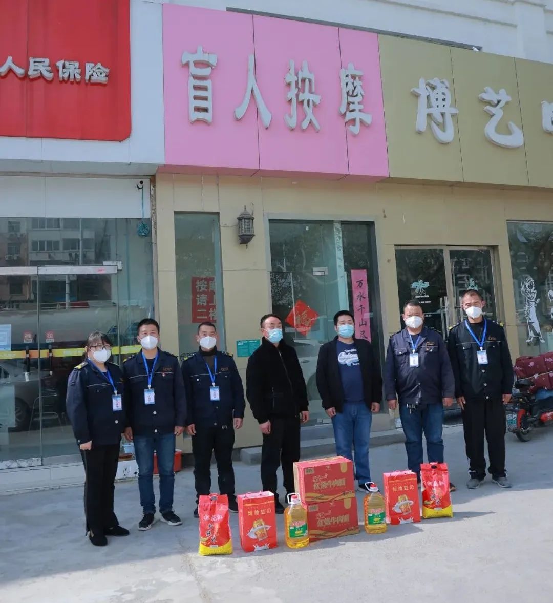 于是,在4月9日早上,新城公司志愿者李根、吳宗、郭開明、陳新讓、張鐘源、秦娟在取得復工復產(chǎn)工作證后,立刻一起前往超市采購大豆油,大米、面、方便面、成箱奶、水果、蔬菜等物資,不能趕來的志愿者蔣林和張濤為此也捐了款,在第一時間把物資送到孫彩云所在的小區(qū)及盲人按摩店里。