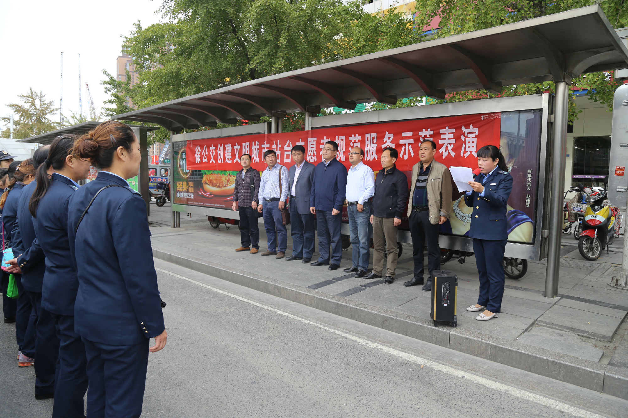 為進一步規(guī)范站臺服務引導工作,不斷推動文明城市創(chuàng)建順利進行,10月9日上午,公司在徐州站主廣場舉行了一次公交站臺秩序規(guī)范服務示范表演。團市委副書記夏友峰、運管處客運科科長陳福升、以及市創(chuàng)建辦交通秩序二組三位領導蒞臨觀摩。服務督導隊34名站臺志愿者參加了示范表演。