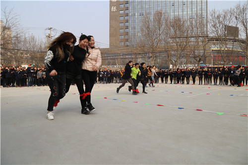 “參賽隊員各就各位!裁判員準備計時!”運動會主持人一聲令下,首先開始比拼的項目是需要隊員齊心協(xié)力,發(fā)揚合作精神的“三人四足接力賽”,三人一組紅繩綁腿齊步走,每隊12名參賽隊員,比的是速度,更是勁兒往一處使的同心合力。“加油!加油??!”“一二!一二!”比賽場上運動員的號子聲和場外女工們的加油聲、歡笑聲交織一起,此起彼伏。