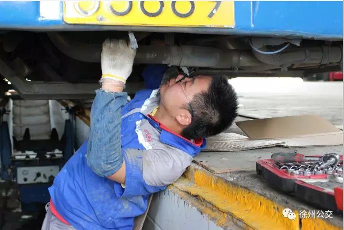 年齡不大、2011年開始干保修的王超然已然是小修車間的主力軍了,此時他正蜷縮著蹲在地溝維修車輛底盤,一會兒鋪張紙板躺地上,一會兒鉆進后車底架。頭頂蒸籠似的公交車底盤,還要承受車部件散發(fā)的熱量,上蒸下烤,猶如鉆進烤箱,藍色工作服早就汗水和著油泥沾滿衣襟。因為故障車多,上班到現(xiàn)在幾小時沒來及休息一下喝口水了,兩手油污的他甚至不方便去擦一下滿臉的汗水。