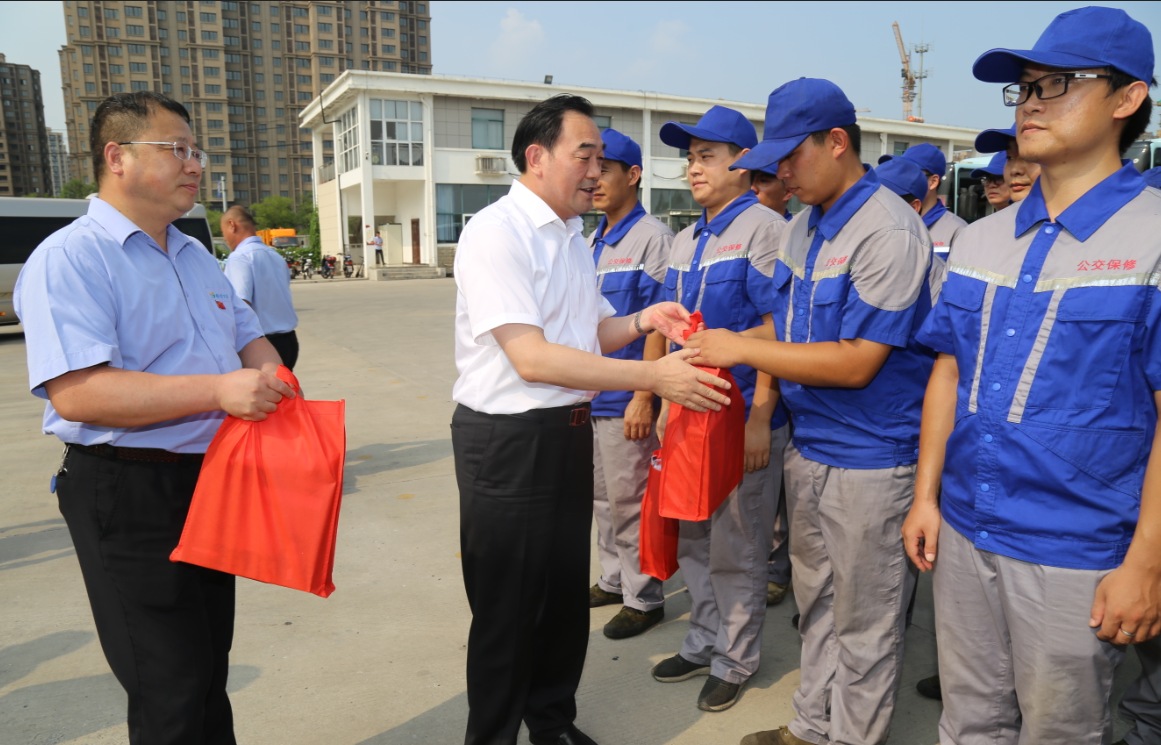 在烈日下的公交郭莊停車場,周鐵根書記看到堅(jiān)守崗位的公交員工們汗流浹背,親切地上前與公交駕駛員、修理人員等一線員工一一握手。“大家辛苦了!感謝你們!”他對廣大公交員工為保障全市人民高溫天氣正常出行所付出的辛勤勞動(dòng)表示充分肯定,又將洗發(fā)水、毛巾、肥皂等降暑物品,以及《安全生產(chǎn)知識(shí)職工普及讀本》等書一一送到公交員工手中,叮囑有關(guān)負(fù)責(zé)人,要多愛護(hù)、關(guān)心一線職工,切實(shí)做好防暑降溫措施,為公交員工創(chuàng)造好的工作條件,切實(shí)維護(hù)廣大職工的安康權(quán)益,確保高溫天里職工的身體健康和安全生產(chǎn),讓職工安全度夏、清涼度夏,真正感受到黨和政府的關(guān)懷、工會(huì)組織的關(guān)心和社會(huì)各界的關(guān)愛。他還關(guān)心地叮囑公交員工們要?jiǎng)谝萁Y(jié)合,做好高溫防護(hù),保重身體,杜絕疲勞駕駛,確保安全行車,并希望大家更好地堅(jiān)守崗位、服務(wù)群眾,為保障市民安全有序的出行環(huán)境,打造我市優(yōu)化營商環(huán)境、營造文明城市良好氛圍做出更大的貢獻(xiàn)。